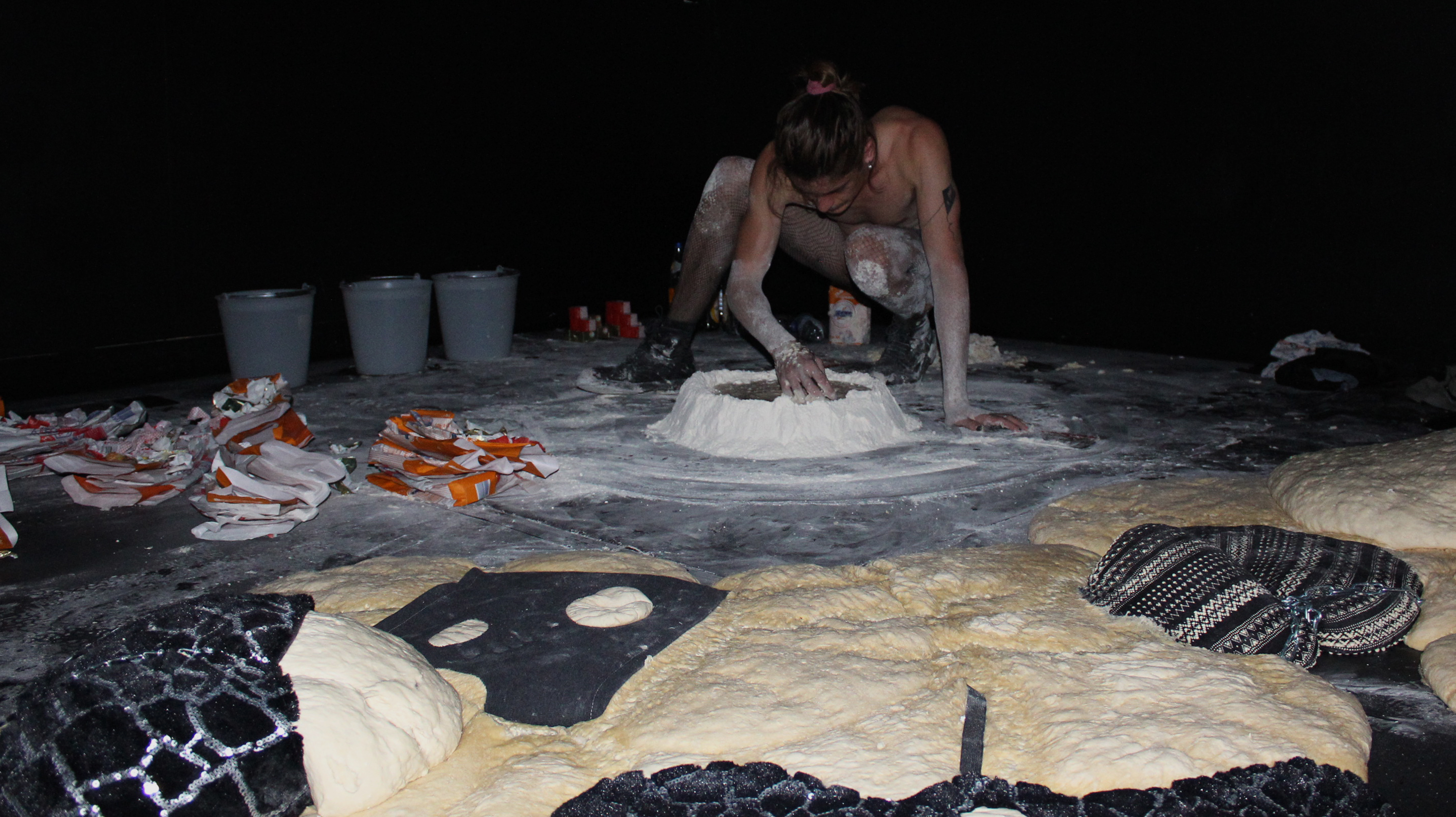 (en) Over the course of two evenings (Plus-Floor, 1th and 2nd of August, 19:00 to 00:00): 90kg of flour, 45kg of water, 3,5kg of salt, 3,78kg of yeast have been used to build 15 doughs, wich have been dressed with accessories of leather, lace or chains. These 15 bodies were able to grow up to 3 times their size, producing a shapeless, united mass of about 140kg.
